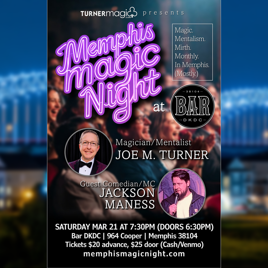 Our show features professional magician and mentalist Joe M. Turner accompanied by a guest comedian from the Memphis area. Enjoy laughter, legerdemain, and your choice of libations as you are amazed and amused by our fun and enthusiastic performers! At this performance Joe will be joined by Memphis comedian and comedy producer Jackson Maness. Our Instagram is @memphismagicnight