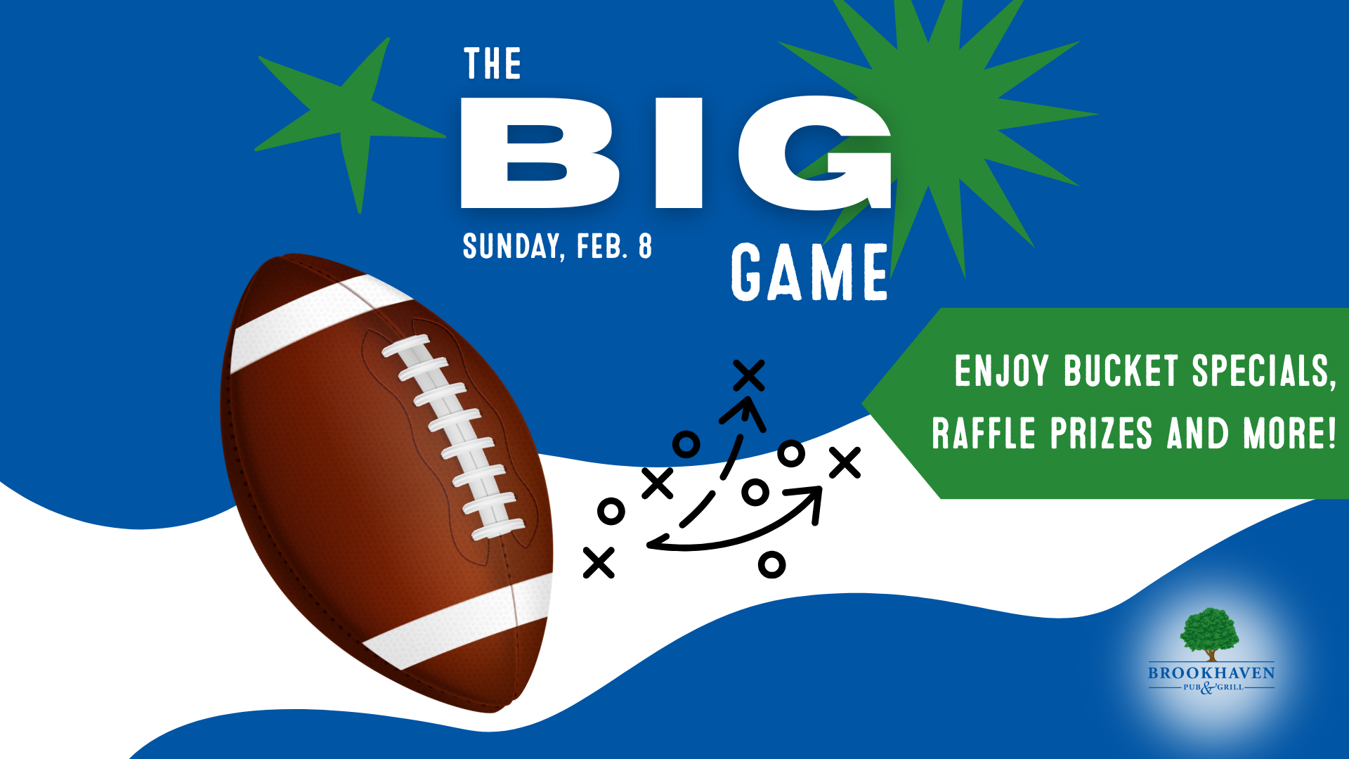HomeEventsWatch the BIG Game at Brookhaven! Watch the BIG Game at Brookhaven! Sunday, February 08, 2026 5:30 PM - 1:00 AM 5:30 PM - 1:00 AM See all dates and Times Brookhaven Pub & Grill Parking Deals Get a Ride LYFT UBER Add to Calendar 02/08/2026 05:30 PM 02/09/2026 01:00 AM America/Bahia_Banderas Watch the BIG Game at Brookhaven! We've got 17 TVs and cold beer to sip, plus food specials, giveaways and more. ๐Event LinksFacebook: https://go.evvnt.com/3438697-0 Details & Tickets: https://www.upcomingevents.com/memphis/events/brookhaven-pub-grill/watch-the-big-game-at-brookhaven-588842?ref=uceaddevent Brookhaven Pub & Grill, 695 West Brookhaven Circle, Memphis, TN, 38117 Set Reminder Categories Fitness-Oriented, Outdoor Event, Outdoors & Recreation, Sports, Sports Event We've got 17 TVs and cold beer to sip, plus food specials, giveaways and more. ๐Event LinksFacebook: https://go.evvnt.com/3438697-0