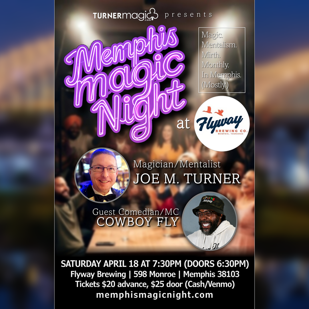 Our show features professional magician and mentalist Joe M. Turner accompanied by a guest comedian from the Memphis area. Enjoy laughter, legerdemain, and your choice of libations as you are amazed and amused by our fun and enthusiastic performers! At this performance Joe will be joined by Memphis comedian Cowboy Fly.