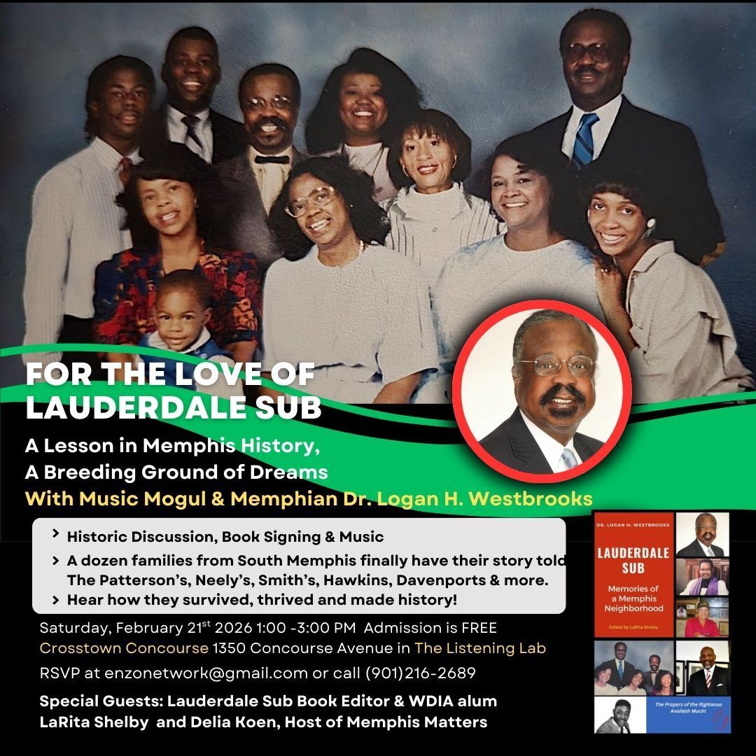 Dr. Logan H. Westbrooks, presents a historic discussion, book signing, and music, highlighting the lived experiences of more than a dozen families whose stories helped shape Lauderdale Sub. Attendees will hear firsthand how these families survived, thrived, and made history. The event takes place Saturday, February 21, 2026, from 1:00–3:00 PM at Crosstown Concourse (The Listening Lab) and includes special guests LaRita Shelby and Delia Koen, host of Memphis Matters.