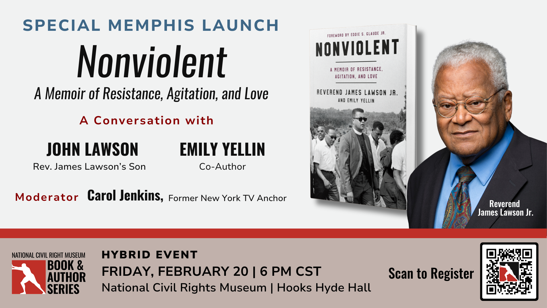 The National Civil Rights Museum will host a national book launch event on Thursday, February 20, celebrating the release of Nonviolent: A Memoir of Resistance, Agitation, and Love, the posthumous memoir of Reverend James Lawson Jr., co-authored with journalist Emily Yellin. The evening will feature Yellin alongside Rev. Lawson’s eldest son, John Lawson, in a powerful remembrance of one of the Civil Rights Movement’s most influential yet often underrecognized architects. A book signing will follow the program.