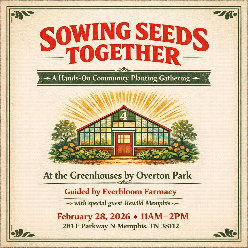 Sowing Seeds Together is a hands-on, community-centered workshop designed to empower you to become an urban gardener. Hosted by Everbloom Farmacy with special guest Dana Sanders from Rewild Memphis at the Overton Park Greenhouse, this experience will equip you with the knowledge, tools, and confidence to grow your own food and nourish your well-being.