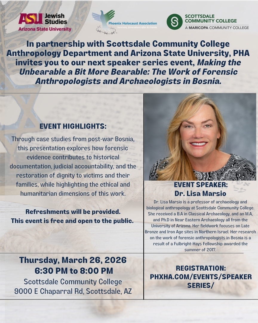 Dr. Lisa Marsio is a professor of archaeology and biological anthropology at Scottsdale Community College. She received a B.A in Classical Archaeology, and an M.A, and Ph.D in Near Eastern Archaeology all from the University of Arizona. Her fieldwork focuses on Late Bronze and Iron Age sites in Northern Israel. Her research on the work of forensic anthropologists in Bosnia is a result of a Fulbright-Hays Fellowship awarded the summer of 2017.