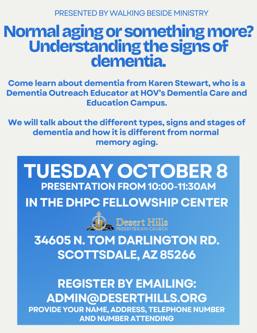 On Tuesday, October 8, Desert Hills Presbyterian Church (DHPC) will host an important seminar titled, “What is Dementia Anyway?” Presented by Walking Beside Ministry and led by Dr. Maribeth Gallagher, Director of Supportive Care for Hospice of the Valley’s Dementia Program, the seminar will provide education about the different types of dementia, its signs and stages, and how it differs from normal memory aging. The seminar will take place in the DHPC Fellowship Center, 34605 N. Tom Darlington Rd., Scottsdale, Ariz. 85266.