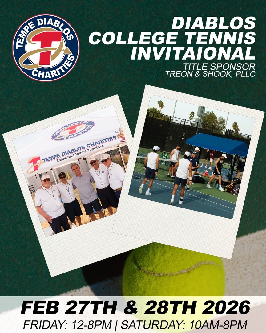 The Tempe Diablos and Arizona State University Men’s Tennis have partnered for the fourth annual Diablos College Tennis Invitational Presented by Treon & Shook, PLLC. The tournament on February 27, 2026 and February 28, 2026, will feature eight of the nation’s top men’s college tennis teams. This year’s teams include Arizona State, Arizona, Washington, Liberty, Boise State, Michigan State, Tulane and UC Santa Barbara. The teams will play a round robin style tournament at Kiwanis Tennis Center in Tempe.