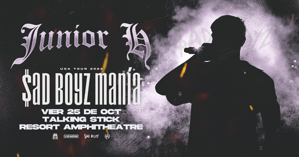 HomeEventsJunior H: Sad Boyz Mania Tour 2024 This Event has Passed Junior H: Sad Boyz Mania Tour 2024 Friday, October 25, 2024 8:00 PM - 11:00 PM 8:00 PM - 11:00 PM See all dates and Times Talking Stick Resort Amphitheatre - Phoenix Parking Deals Get a Ride LYFT UBER Add to Calendar 10/25/2024 08:00 PM 10/25/2024 11:00 PM America/Boise Junior H: Sad Boyz Mania Tour 2024 General Parking will be included in the final purchase price.Event LinksTickets: https://go.evvnt.com/2531971-0 Details & Tickets: https://www.upcomingevents.com/phoenix/events/talking-stick-resort-amphitheatre-phoenix/junior-h-sad-boyz-mania-tour-2024-267039?ref=uceaddevent Talking Stick Resort Amphitheatre - Phoenix, 2121 North 83rd Avenue, Phoenix, AZ, 85035 Set Reminder Categories Indoor / Outdoor Event, Live Entertainment, Live Performance, Performing Arts General Parking will be included in the final purchase price.Event LinksTickets: https://go.evvnt.com/2531971-0