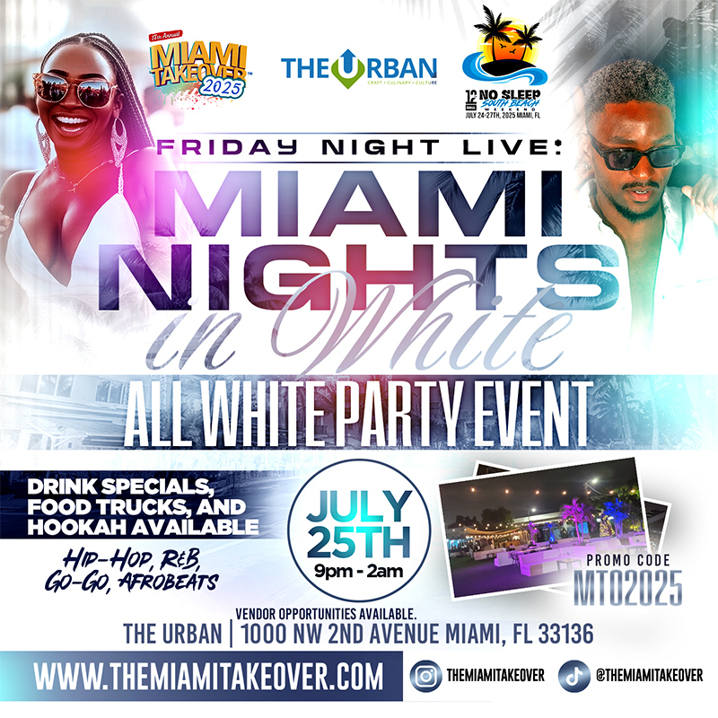 Join The Miami Takeover in collaboration with No Sleep South Beach on Friday, July 25th, 2025 from 9 p.m. to 2 a.m. with an energizing Miami nightlife experience at The Urban located in the heart of historic Overtown Miami (1000 NW 2nd Ave., Miami, FL 33136). HBCU grads, Black professionals, cultural tastemakers and fashionista alike are coming together to experience immaculate vibes at this expansive indoor & outdoor venue that can hold up to 2,000 attendees. A vibrant live DJ set featuring the best hip-hop, R&B, go-go music, and afro-beats will be in rotation as new and old friends enjoy cocktails and a lively nightlife experience. Having garnered a reputation for hosting some of Miami’s most iconic global nightlife events during Art Basel and Swim Week with top A-List celebrities like Monica, Teyana Taylor, Trina and more, The Urban is known for bringing together Miami’s beautiful ladies and gentlemen for an unforgettable night celebrating culture, music, art and HBCU’s. Attendees have access to numerous bars, on-site food trucks, bottle & table service, hookah specials and premium cocktails.