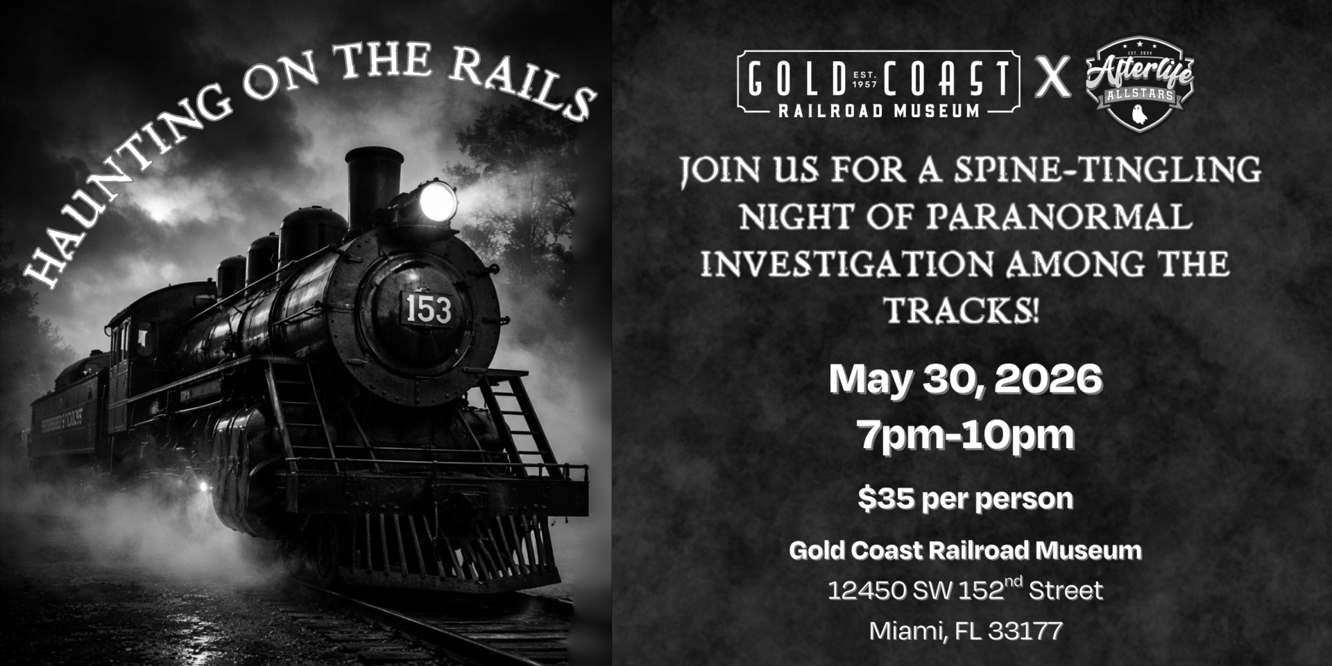 Step into the shadows at the Gold Coast Railroad Museum for a thrilling night of paranormal investigation during Haunting on the Rails.Join experienced investigators from Afterlife Allstars as you explore historic railcars and museum grounds after dark, using real ghost-hunting equipment to search for unexplained activity. Whether you’re a believer or just curious, this spine-tingling experience offers a unique chance to investigate one of Miami’s most fascinating historic locations.May 30, 2026 | 7:00 PM – 10:00 PM$35 per person Ages 16+ only. Guests ages 16–17 must be accompanied by an adult.