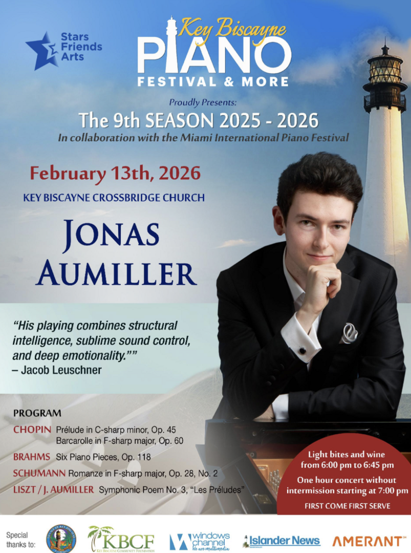 HomeEventsKey Biscayne Piano Festival: Jonas Aumiller This Event has Passed Key Biscayne Piano Festival: Jonas Aumiller Friday, February 13, 2026 6:00 PM - 8:45 PM 6:00 PM - 8:45 PM See all dates and Times 160 Harbor Dr Parking Deals Get a Ride LYFT UBER Add to Calendar 02/13/2026 06:00 PM 02/13/2026 08:45 PM America/Atikokan Key Biscayne Piano Festival: Jonas Aumiller The program spans works by Chopin, Brahms, Schumann, and Liszt, highlighting Aumiller’s blend of structural clarity and expressive depth. Light bites and wine will be served. Free. Details & Tickets: https://www.upcomingevents.com/miami/events/160-harbor-dr/key-biscayne-piano-festival-jonas-aumiller-602546?ref=uceaddevent 160 Harbor Dr, 160 Harbor Drive, Key Biscayne, FL, 33149 Set Reminder Categories Indoor / Outdoor Event, Live Entertainment, Live Performance, Performing Arts The program spans works by Chopin, Brahms, Schumann, and Liszt, highlighting Aumiller’s blend of structural clarity and expressive depth. Light bites and wine will be served. Free.