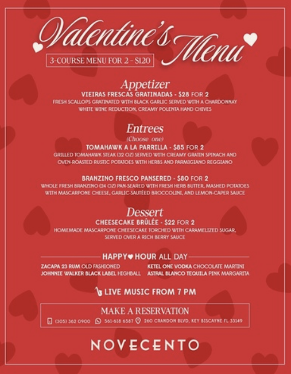 The prix-fixe experience features fresh gratinated scallops to start, followed by a choice of grilled tomahawk steak or pan-seared whole branzino, and finishes with a mascarpone cheesecake brûlée. A curated Valentine’s cocktail selection is available all day, with live music. Reservations are recommended.