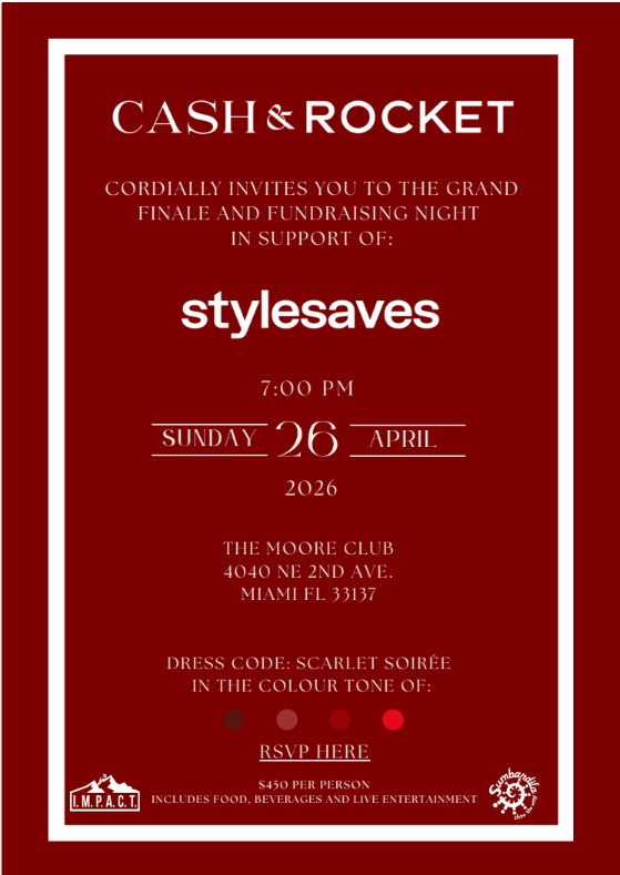 Taking place at 7:00 PM on Sunday, April 26, 2026, at The Moore Club in Miami’s Design District, this vibrant Scarlet Soirée will bring together philanthropists, tastemakers, and community supporters for an evening of purpose and celebration. Guests will enjoy curated cuisine, premium beverages, and live entertainment in a sophisticated setting, closing the Cash & Rocket journey with a memorable night dedicated to style, generosity, and meaningful impact.