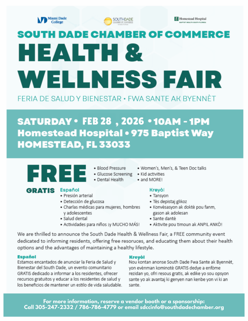 Nou kontan anpil pou anonse Fwa Sante ak Byennèt South Dade, yon evènman kominotè GRATIS ki fèt pou enfòme rezidan yo, ofri resous gratis, epi edike yo sou opsyon sante yo ak avantaj ki genyen lè yo kenbe yon vi ki an sante.