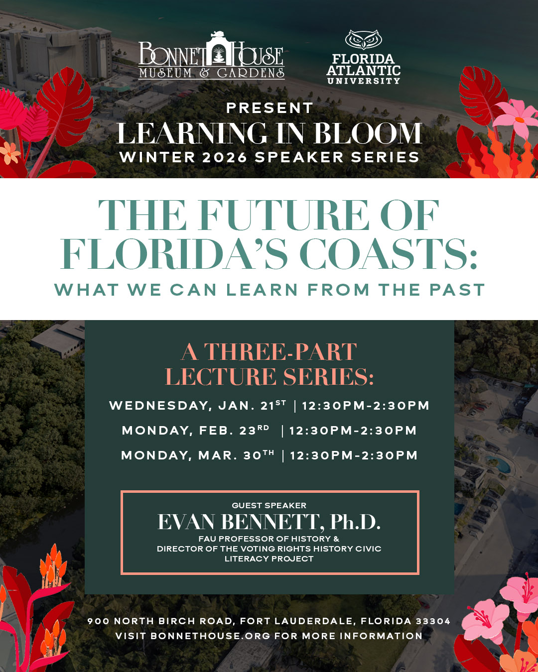 Bonnet House Museum & Gardens is pleased to announce a new three-part lecture series in partnership with Florida Atlantic University (FAU) as part of its 2026 programming. Held on the museum’s historic estate, the series will examine Florida’s coastal history and the evolving relationship between Floridians and the sea over the past 2,000 years. Evan Bennett PhD., FAU Professor of History and renowned historian, will lead the series, titled The Future of Florida’s Coasts: What We Can Learn from the Past.