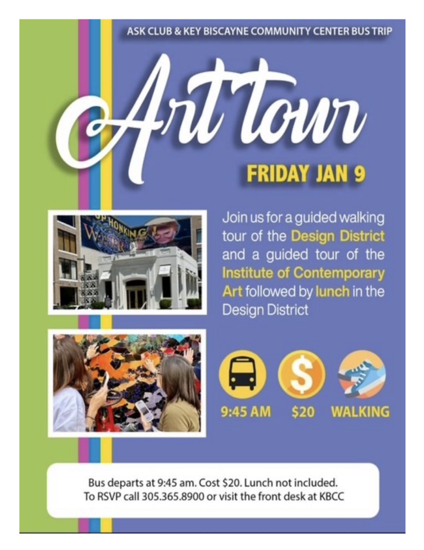 HomeEventsArt Tour Bus Trip Art Tour Bus Trip Friday, January 09, 2026 9:45 AM - 2:00 PM 9:45 AM - 2:00 PM See all dates and Times Key Biscayne Community Center Parking Deals Get a Ride LYFT UBER Add to Calendar 01/09/2026 09:45 AM 01/09/2026 02:00 PM America/Atikokan Art Tour Bus Trip The cost is $20, with lunch not included, and the experience involves walking. RSVP is available at the front desk. KBCC. Details & Tickets: https://www.upcomingevents.com/miami/events/key-biscayne-community-center/art-tour-bus-trip-580730?ref=uceaddevent Key Biscayne Community Center, 10 Village Green Way, Key Biscayne, FL, 33149 Set Reminder Categories Arts Oriented, Indoor / Outdoor Event The cost is $20, with lunch not included, and the experience involves walking. RSVP is available at the front desk. KBCC.