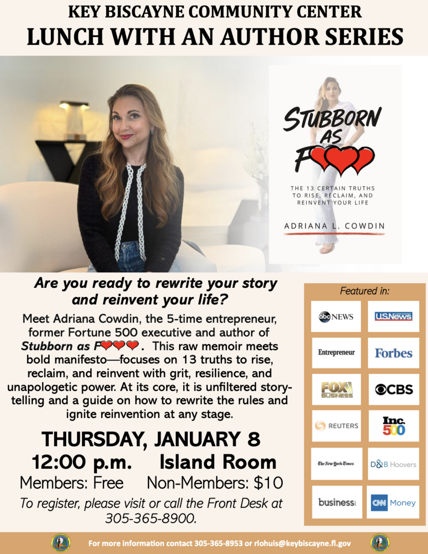 HomeEventsLunch with Author Series: Adriana Cowdin Lunch with Author Series: Adriana Cowdin Thursday, January 08, 2026 12:00 PM - 2:00 PM 12:00 PM - 2:00 PM See all dates and Times Key Biscayne Community Center Parking Deals Get a Ride LYFT UBER Add to Calendar 01/08/2026 12:00 PM 01/08/2026 02:00 PM America/Atikokan Lunch with Author Series: Adriana Cowdin Cowdin shares insights drawn from her experience as a former Fortune 500 executive and five-time entrepreneur. Free for members; $10 for non-members. Details & Tickets: https://www.upcomingevents.com/miami/events/key-biscayne-community-center/lunch-with-author-series-adriana-cowdin-580727?ref=uceaddevent Key Biscayne Community Center, 10 Village Green Way, Key Biscayne, FL, 33149 Set Reminder Categories Education, Educational, Good For Families Neighborhoods Brickell (Miami)Fair Isle (Miami)North-East Coconut Grove (Miami)Virginia Key (Miami) Cowdin shares insights drawn from her experience as a former Fortune 500 executive and five-time entrepreneur. Free for members; $10 for non-members.
