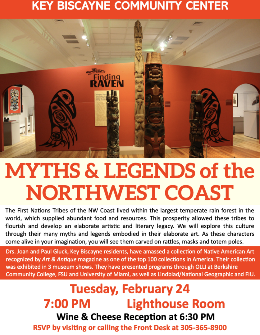 Through carved masks, rattles, and totem poles, the program examines how myth, environment, and imagination shaped one of the world’s most visually powerful cultural legacies. Drs. Joan and Paul Gluck, longtime Key Biscayne residents and collectors of Native American art, will share insights from their nationally recognized collection and museum exhibitions. A wine and cheese reception will precede the presentation.
