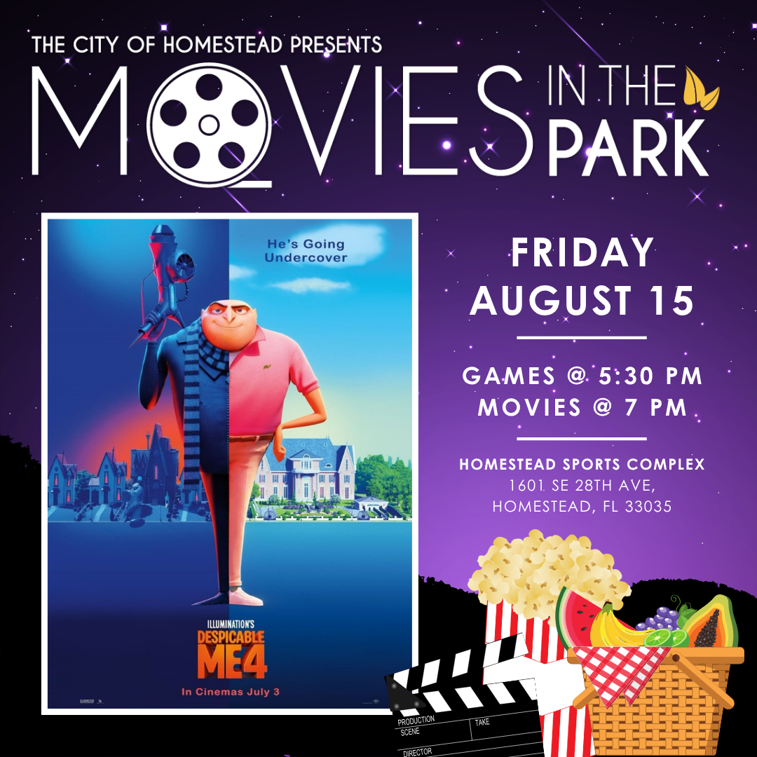 HomeEventsMovies in the Park: Despicable Me 4 This Event has Passed Movies in the Park: Despicable Me 4 Friday, August 15, 2025 7:00 PM - 10:00 PM 7:00 PM - 10:00 PM See all dates and Times Losner Park Parking Deals Get a Ride LYFT UBER Add to Calendar 08/15/2025 07:00 PM 08/15/2025 10:00 PM America/Atikokan Movies in the Park: Despicable Me 4 Movies in the Park: Despicable Me 4 Date: August 15, 2025 Time: 7:00 PM - 10:00 PM Location: Losner Park Address: 104 N. Krome Avenue, Homestead, FL 33030 Details & Tickets: https://www.upcomingevents.com/miami/events/losner-park/movies-in-the-park-despicable-me-4-497149?ref=uceaddevent Losner Park, 104 North Krome Avenue, Homestead, FL, 33030 Set Reminder Categories Benefits Charity, Fundraising & Charity, Neighborhood, Politics & Activism Movies in the Park: Despicable Me 4 Date: August 15, 2025 Time: 7:00 PM - 10:00 PM Location: Losner Park Address: 104 N. Krome Avenue, Homestead, FL 33030