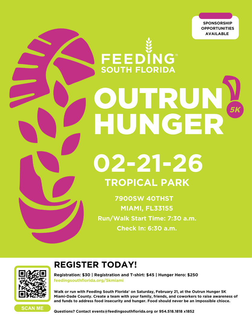 Take steps against hunger! On Saturday, Feb. 21, 2026, Feeding South Florida®, the leading hunger-relief organization in South Florida, will host its Annual Outrun Hunger 5K Miami. Runners, walkers, families and community leaders of all ages will come together to take steps to raise funds and awareness to end hunger in South Florida at Tropical Park in Miami.