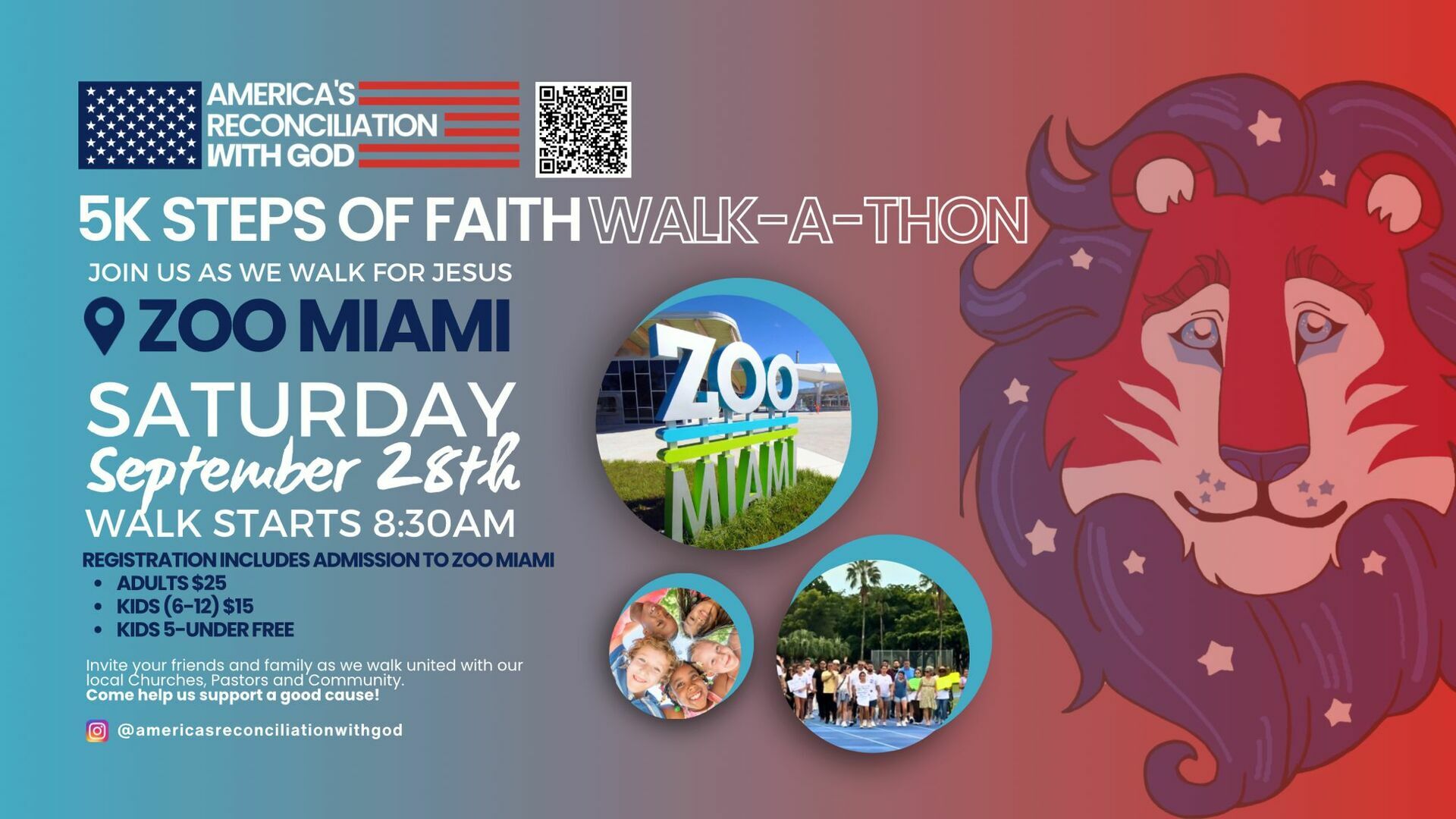 Come see the Bible come to life as we will have biblical characters throughout the route. Enjoy a fun filled day with friends and family at Zoo Miami. Admission to the walk/run also incudes admission to the Zoo for the remainder of the day. Early registration will start at 7:30 am. Walk starts at 8:30am and ends at 10:30am. Closing remarks from 10:30am to 11:00am. Take pictures with the United Superheroes of Miami who will be attending. Epilepsy Alliance of Florida will be giving away 100 Helmets to kids in need. Come join us as we walk/run in the name of Jesus. Community service hours available for HS students