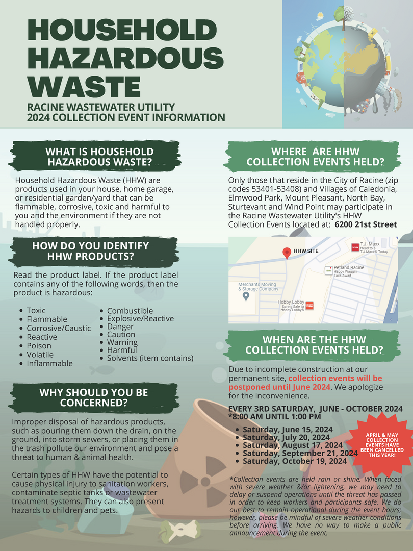 Household hazardous waste (HHW) are products used in your house, home garage or residential garden/yard that can be flammable, corrosive, toxic or harmful to you and the environment. This collection provides the opportunity to the residents within the Racine Wastewater Utility service area to safely dispose of these unused or unwanted harmful materials. This is not a county wide program.