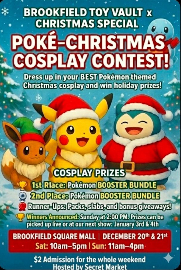 Poké-Christmas and Brookfield Toy Vault Pokemon Cards and Collectibles Show, 10 a.m. to 5 p.m. Saturday and 11 a.m. to 4 p.m. Sunday, Brookfield Square, 95 N. Moorland Road, Brookfield. Cosplay fun and prizes. $2 admission.