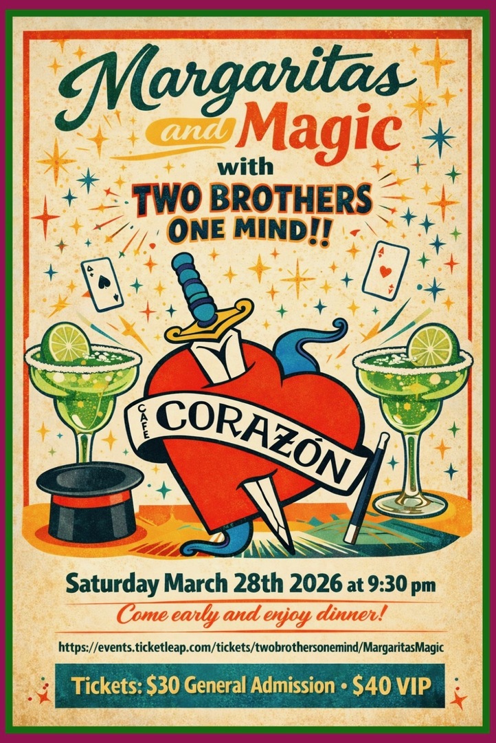 Come celebrate and get ready for an unforgettable evening of Margaritas & Magic at Café Corazón hosted by "The Best Magicians in Milwaukee" Two Brothers One Mind.