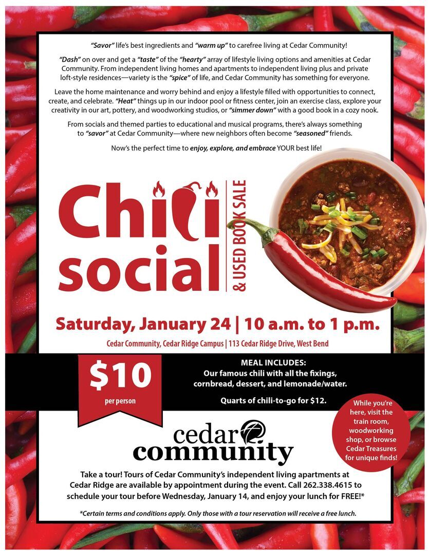 Chili Social and Used Book Sale, 10 a.m. to 1 p.m. Saturday, Cedar Ridge Campus, 113 Cedar Ridge Drive, West Bend. Cost of chili, cornbread, dessert, and lemonade/water is $10 or quarts to go for $12.