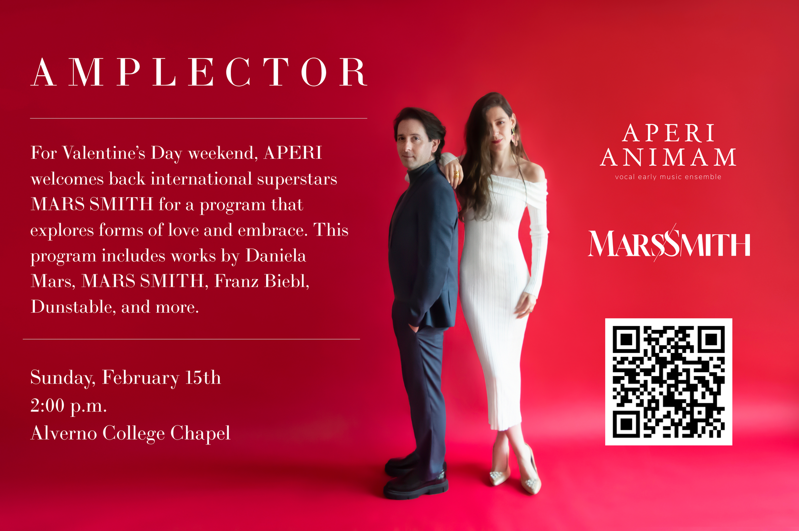 Join the tenors and basses of APERI ANIMAM this Valentine’s Day weekend as they welcome back the international superstar duo MARS SMITH for an evocative program exploring themes of love and embrace. Recording artist and Grammy Award nominated flautist Daniela Mars and Grammy Award winner and founder of VOCES8 Paul Smith bring their signature artistry and original compositions to this exciting collaboration. This program will also feature music by Franz Biebl, John Dunstable and others.