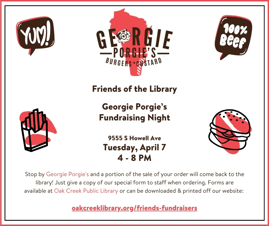 Eat tasty food and support the library! Stop by Georgie Porgie's on Tuesday, April 7 from 4:00 - 8: 00 p.m. and a portion of the sale of your order will come back to the library! You will need to give a copy of a special form to staff when ordering. Forms are available at Oak Creek Public Library in late March/early April or can be downloaded & printed off our website at any time.