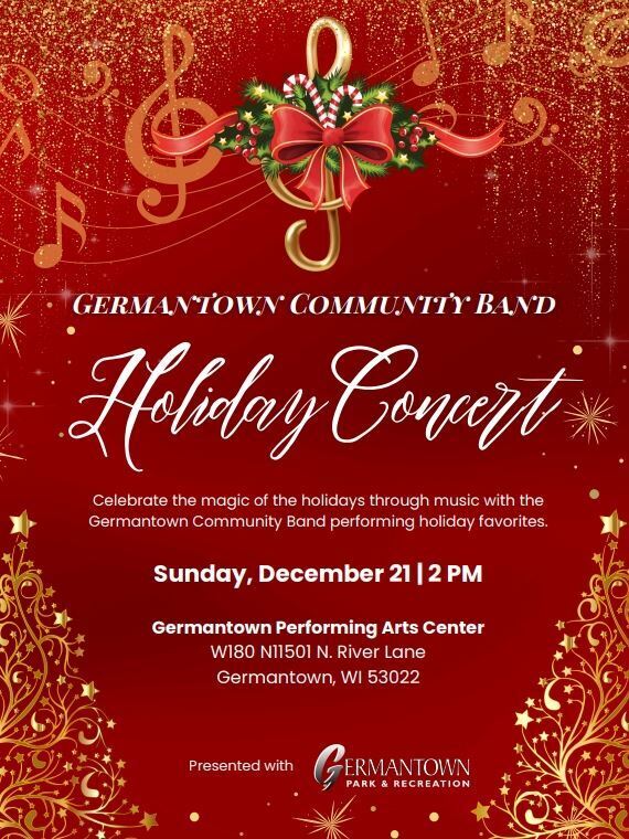 HomeEventsGermantown Community Band Holiday Concert Germantown Community Band Holiday Concert Sunday, December 21, 2025 2:00 PM - 4:00 PM 2:00 PM - 4:00 PM See all dates and Times Germantown School District Performing Arts Center Parking Deals Get a Ride LYFT UBER Add to Calendar 12/21/2025 02:00 PM 12/21/2025 04:00 PM America/Bahia_Banderas Germantown Community Band Holiday Concert Germantown Community Band Holiday Concert, 2 p.m. Sunday, Germantown PAC, W180-N11501 River Lane, Germantown. Tickets are $6. Details & Tickets: https://www.upcomingevents.com/milwaukee/events/germantown-school-district-performing-arts-center/germantown-community-band-holiday-concert-575463?ref=uceaddevent Germantown School District Performing Arts Center, W180N11501 North River Lane, Germantown, WI, 53022 Set Reminder Categories Good For Families, Holiday, Indoor / Outdoor Event, Kid-Friendly, Kids & Family, Live Entertainment, Live Performance, Performing Arts Germantown Community Band Holiday Concert, 2 p.m. Sunday, Germantown PAC, W180-N11501 River Lane, Germantown. Tickets are $6.