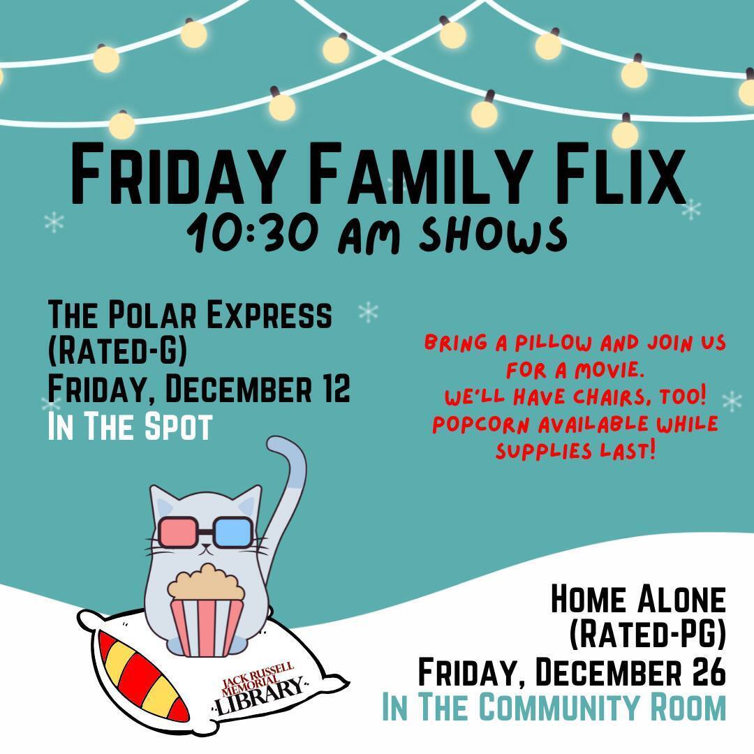 HomeEventsFamily Flix: “Home Alone” This Event has Passed Family Flix: “Home Alone” Friday, December 26, 2025 10:30 AM - 12:30 PM 10:30 AM - 12:30 PM See all dates and Times Jack Russell Memorial Library Parking Deals Get a Ride LYFT UBER Add to Calendar 12/26/2025 10:30 AM 12/26/2025 12:30 PM America/Bahia_Banderas Family Flix: “Home Alone” Family Flix: “Home Alone,” 10:30 a.m. Friday, Jack Russell Memorial Library, 100 Park Ave., Hartford. Popcorn available while supplies last. Details & Tickets: https://www.upcomingevents.com/milwaukee/events/jack-russell-memorial-library/family-flix-home-alone-579243?ref=uceaddevent Jack Russell Memorial Library, 100 Park Avenue, Hartford, WI, 53027 Set Reminder Categories Arts Oriented, Film, Performing Arts Family Flix: “Home Alone,” 10:30 a.m. Friday, Jack Russell Memorial Library, 100 Park Ave., Hartford. Popcorn available while supplies last.