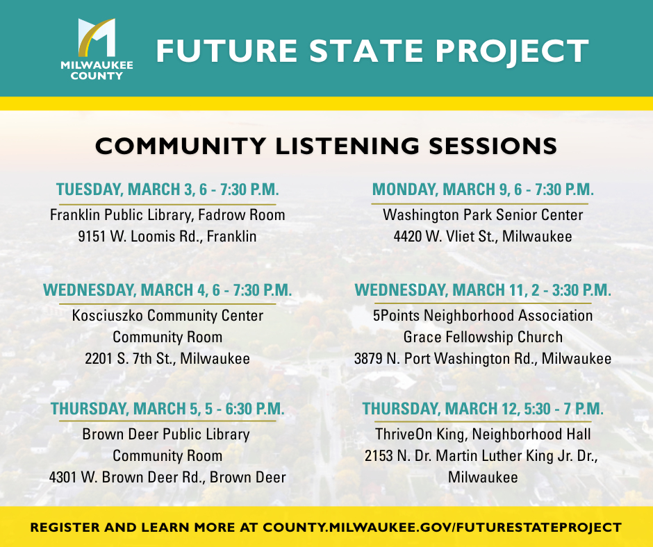 Please visit the Future State website to register and learn more about Future State project: county.milwaukee.gov/FutureStateProject.
