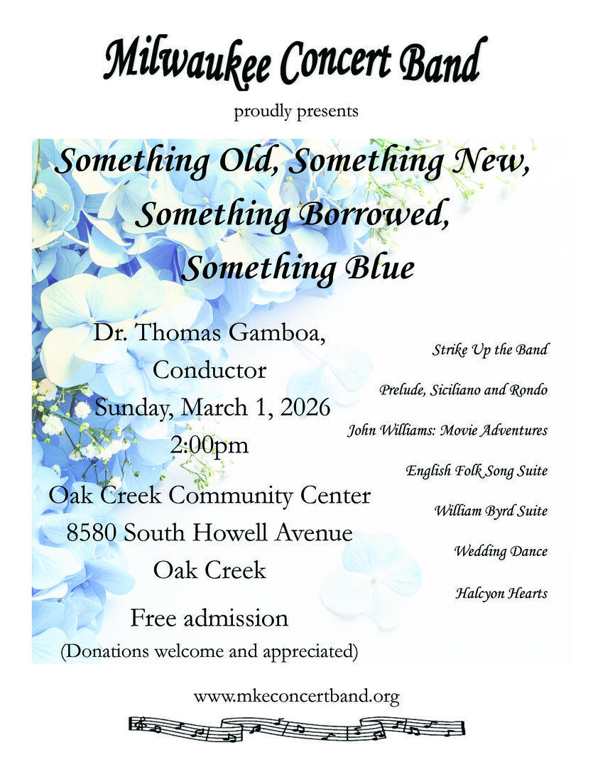 The Milwaukee Concert Band celebrates “Something Old, Something New, Something Borrowed, Something Blue” in a midwinter concert set to warm hearts. From medieval to modern, the music delivers excitement. Enjoy selections like The William Byrd Suite, Strike up the Band, and a rousing Wedding Dance.