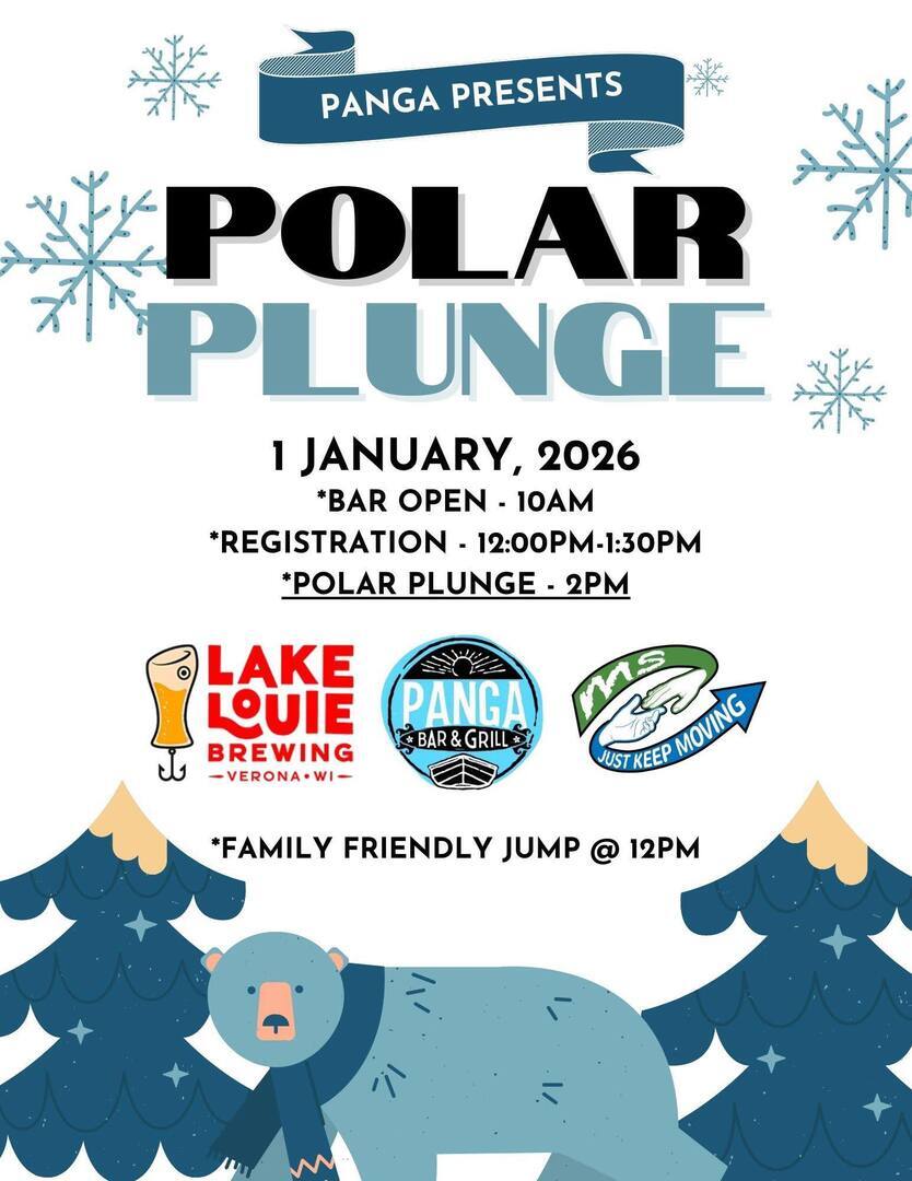 Annual Polar Plunge, noon and 2 p.m. Thursday, Panga Bar & Grill, 34422 Delafield Road, Summit. Supports MS. Bar opens at 10 a.m., registration from noon to 1:30 p.m. Family-friendly plunge at noon, regular plunge at 2 p.m. Heated tent and changing room. Prizes for oldest, youngest, and best dressed.