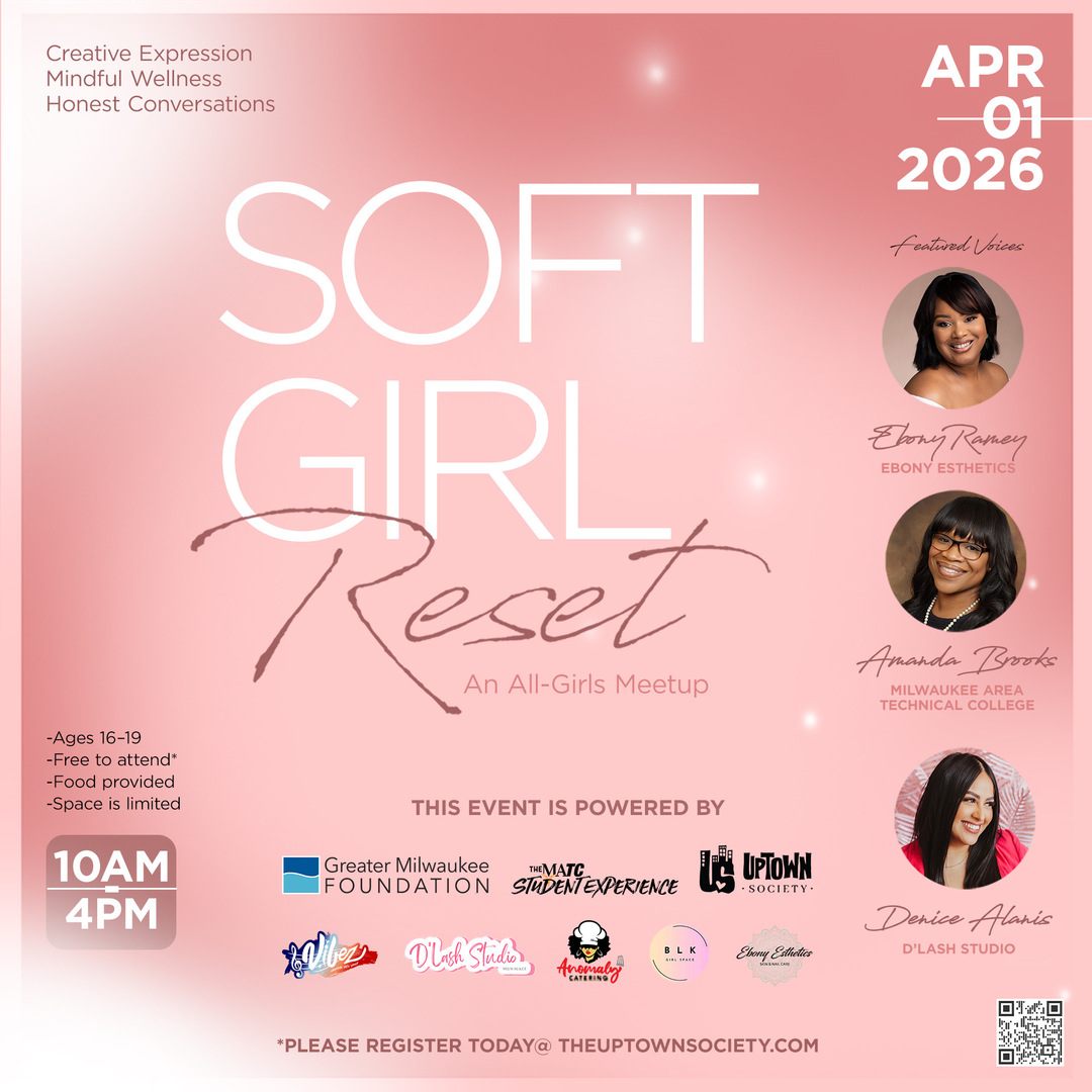Soft Girl Reset: A Creative Wellness Day for Teen GirlsSoft Girl Reset is a guided wellness and creativity experience designed for girls ages 16–19 who need a moment to slow down, connect with others, and reflect on what it means to grow up in today’s world.This thoughtfully structured day blends mentorship, creative expression, and open conversation to help young women explore identity, confidence, and future possibilities in a supportive and welcoming environment.Participants will hear from local women who have built careers and businesses in Milwaukee while engaging in hands-on activities that encourage self-expression, creativity, and meaningful connections with their peers.Throughout the afternoon, we will explore topics such as self-perception, beauty standards, entrepreneurship, mental wellness, and post-high-school opportunities through honest discussion and shared experiences.Guest speakers include Denice Alanis of D'Lash Studio, Amanda Brooks of Milwaukee Area Technical College, and Ebony Ramey of Ebony Esthetic, who will share personal stories from their journeys, lessons learned, and advice for young women navigating early adulthood.Creative time will be led by Blk Girl Space, where participants can take part in a ceramic painting session designed to encourage creativity and self-reflection. Girls who prefer a quieter activity can step outside for fresh air and participate in a guided journaling exercise focused on personal reflection.The afternoon will close with “No Filter Needed,” a facilitated group discussion led by Vibez Creative Arts Space, where participants are invited to talk openly about the realities they are experiencing. This space allows young women to share challenges, celebrate wins, and discuss the support they wish existed. These conversations directly shape future Soft Girl Reset programming and resources.Our goal is simple: create a safe environment where young women feel heard, supported, and inspired to think about their next steps with confidence.Reservation InformationThis event is free to attend. A $10 refundable reservation hold is required to secure a seat due to limited capacity.The reservation fee will be fully refunded within 48 hours after attendance. If a registered participant does not attend, the reservation fee will be donated to Uptown Society to help support future youth programming and community initiatives.If the reservation fee presents a financial barrier, please email [email protected], and we will gladly add your teen to the registration list.Schedule9:30 – 10:00 AMSoft Girl Check In10:00 – 10:30 AMIntroductions10:30 – 11:30 AMFeatured Voice11:30 AM – 12:30 PMLunch and Journaling12:30 PM – 1:30 PMFeatured Voice1:30 PM – 2:30 PMArt IRL2:30 PM – 3:30 PMFeatured Voice3:30 PM – 4:30 PMNo Filter NeededAdditional InformationFood and snacks provided courtesy of Anomaly Catering.Phone check-in required.Participants will check their phones during the event to help everyone stay present and engaged. Phones will remain accessible in case of emergency.Age verification may be required at check-in to ensure participants fall within the intended age range.All materials are provided, including art supplies, journals, snacks, and beverages.Sponsored by:The Greater Milwaukee FoundationMilwaukee Area Technical College