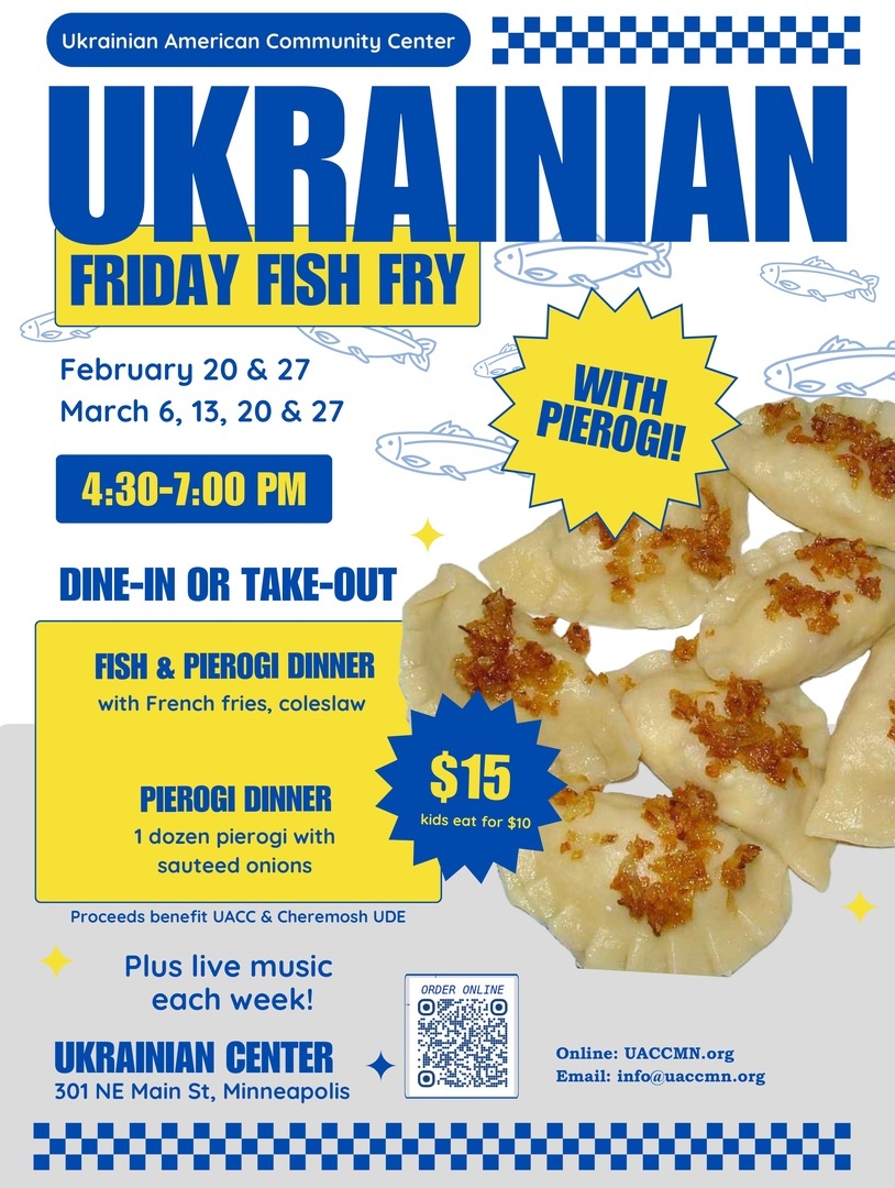 HomeEventsUkrainian Fish Fry Ukrainian Fish Fry Friday, February 20, 2026 4:30 PM - 7:30 PM 4:30 PM - 7:30 PM See all dates and Times 301 NE Main St Parking Deals Get a Ride LYFT UBER Add to Calendar 02/20/2026 04:30 PM 02/20/2026 07:30 PM America/Bahia_Banderas Ukrainian Fish Fry Adults eat for $15 and kids $10Event LinksWebsite: https://go.evvnt.com/3486994-0 Details & Tickets: https://www.upcomingevents.com/minneapolis/events/301-ne-main-st/ukrainian-fish-fry-603902?ref=uceaddevent 301 NE Main St, 301 Northeast Main Street, Minneapolis, MN, 55413 Set Reminder Categories Craft Beer, Food, Wine, Drink Specials Neighborhoods East Bank-Nicollet Island (Minneapolis)Nicollet Island (Minneapolis)St Anthony East (Minneapolis)St Anthony West (Minneapolis) View Event Website » Adults eat for $15 and kids $10Event LinksWebsite: https://go.evvnt.com/3486994-0