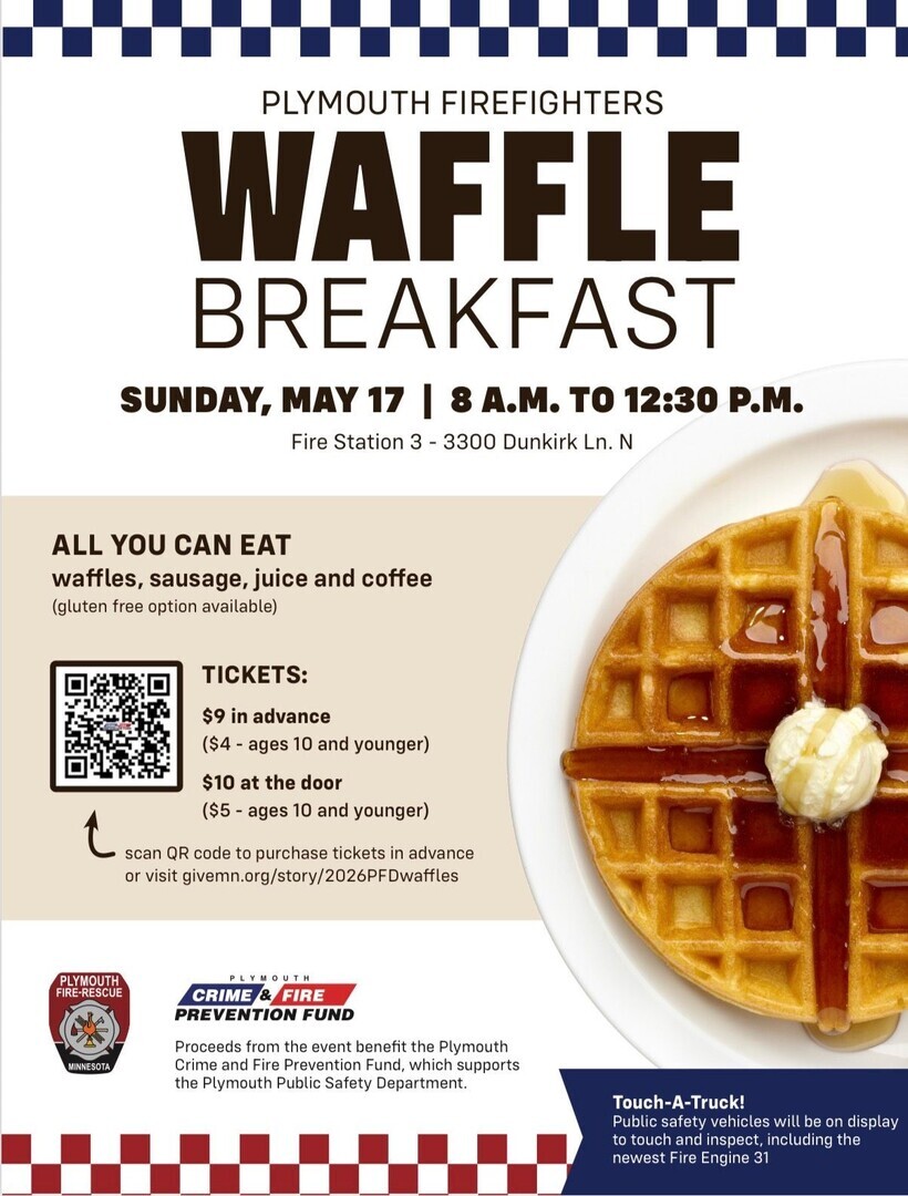 Everyone welcomed to join this Plymouth community event on Sunday, May 17, 2026 from 8:00am -12:30pm. It will be held at Fire Station #3 located at 3300 Dunkirk Lane No. in Plymouth, MN. See the plymouthcrimefire.org website for more details.