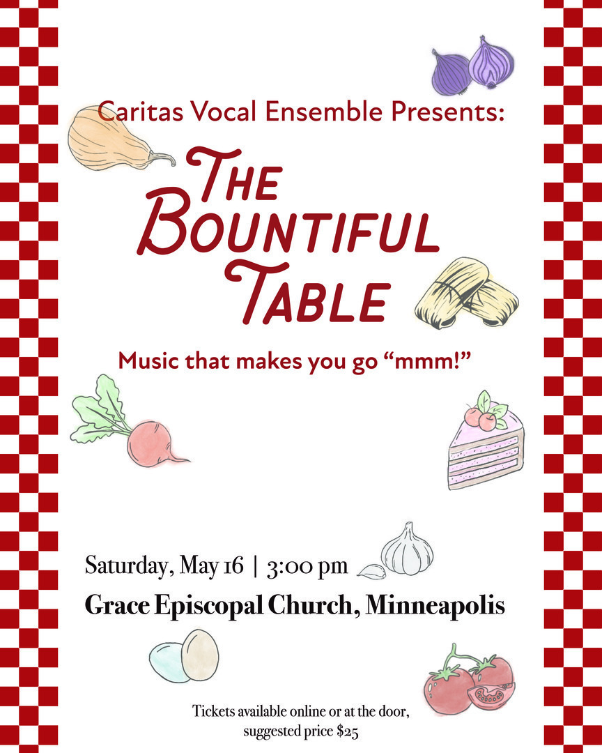 Pull up a chair to The Bountiful Table as Caritas Vocal Ensemble serves up a full helping of delicious harmonies, tasty licks, and sweet rhythms inspired by our favorite foods. Bon appetit! It’s a varied menu—come hear music from Palestrina to Manhattan Transfer and more!