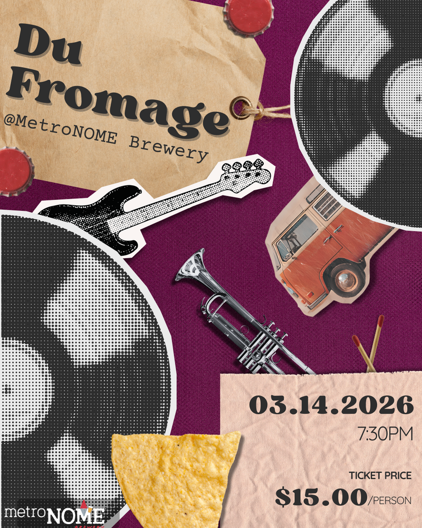 Five-piece Twin-Cities jazz fusion group, Du Fromage, mixes funky grooves with rich harmony to create a sonic pallet that is both vibrant and electrifying. Consisting of Mario Javier Aviles (Guitar), Derek Bell (Bass), Joe Bensing (Keys), Maxwell Reichart (Trumpet & Vocals), and Andrew Kist (Drums), the group came together at Minneapolis College, having connected through a shared passion for live music, jazz fusion, and video game soundtracks.