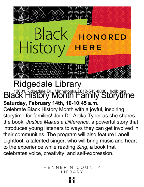 Celebrate Black History Month with a joyful, inspiring storytime for families on February 14th at 10:00 AM! Join Dr. Artika Tyner as she shares the book, Justice Makes a Difference, a powerful story that introduces young listeners to ways they can get involved in their communities. The program will also feature Lanell Lightfoot, a talented singer, who will bring music and heart to the experience while reading Sing, a book that celebrates voice, creativity, and self-expression.