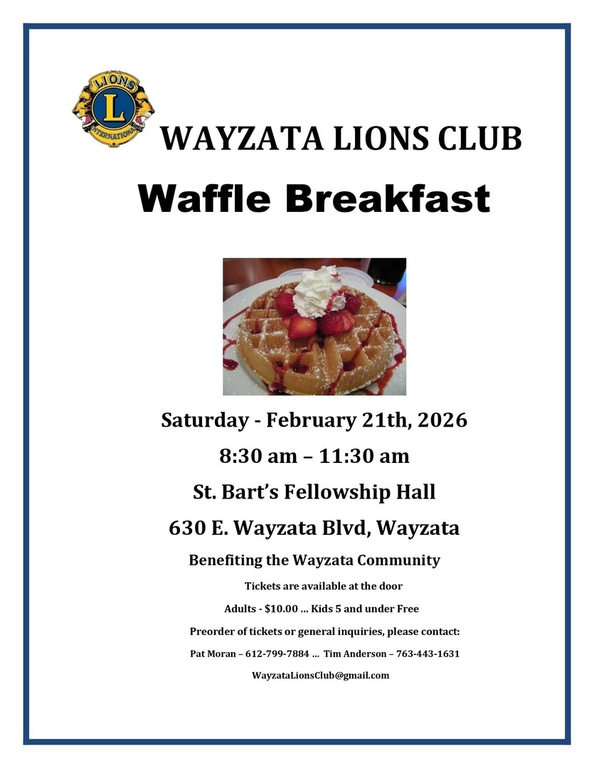 Come join Wayzata Lions Club members, family, friends, and neighbors for a delicious waffle & sausage breakfast, with all the usual waffle trimmings, plus juice & coffee. Entry donation is $10, free for children 5 and under. Tickets will be available at the door, or in advance call Patrick Moran (612)799-7884. See you there!