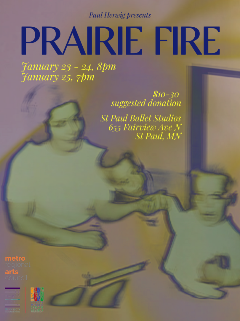 Prairie Fire will be performed in a “white box” raw studio space at St Paul Ballet Studios, within the Fairview Business Center, in Saint Paul, January 23-24 at 8pm, and January 25 at 7pm, 2026. Tickets can be reserved with a suggested donation of $10-$30 and are available now. Three performances only.