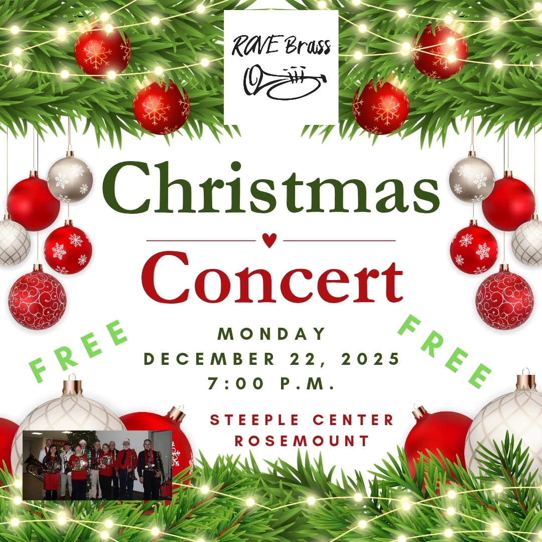 RAVE Brass will play their annual free Christmas Concert on Monday, December 22, 2025 at 7:00 p.m. in Rosemount's Steeple Center, located at 14375 South Robert Trail. Many of the tunes on the setlist are found on the “Billboard Greatest of All Time Holiday 100 Songs”. Other songs include Christmas classics sure to set the mood for a festive holiday.