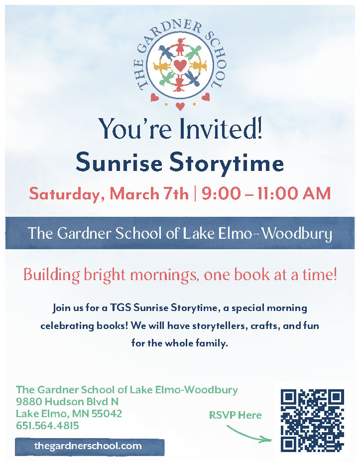 HomeEventsThe Gardner School of Lake Elmo-Woodbury Sunrise Storytime The Gardner School of Lake Elmo-Woodbury Sunrise Storytime Saturday, March 07, 2026 9:00 AM - 11:00 AM 9:00 AM - 11:00 AM See all dates and Times The Gardner School of Lake Elmo-Woodbury Parking Deals Get a Ride LYFT UBER Add to Calendar 03/07/2026 09:00 AM 03/07/2026 11:00 AM America/Bahia_Banderas The Gardner School of Lake Elmo-Woodbury Sunrise Storytime We will have storytellers, crafts, and fun for the whole family. We can't wait to see you there!Event LinksWebsite: https://go.evvnt.com/3497037-0 Details & Tickets: https://www.upcomingevents.com/minneapolis/events/the-gardner-school-of-lake-elmo-woodbury/the-gardner-school-of-lake-elmo-woodbury-sunrise-storytime-607317?ref=uceaddevent The Gardner School of Lake Elmo-Woodbury, 9880 Hudson Boulevard North, Lake Elmo, MN, 55042 Set Reminder Categories Education, Educational, Good For Families, Kid-Friendly, Kids & Family, Neighborhood View Event Website » We will have storytellers, crafts, and fun for the whole family. We can't wait to see you there!Event LinksWebsite: https://go.evvnt.com/3497037-0 Read More View Less