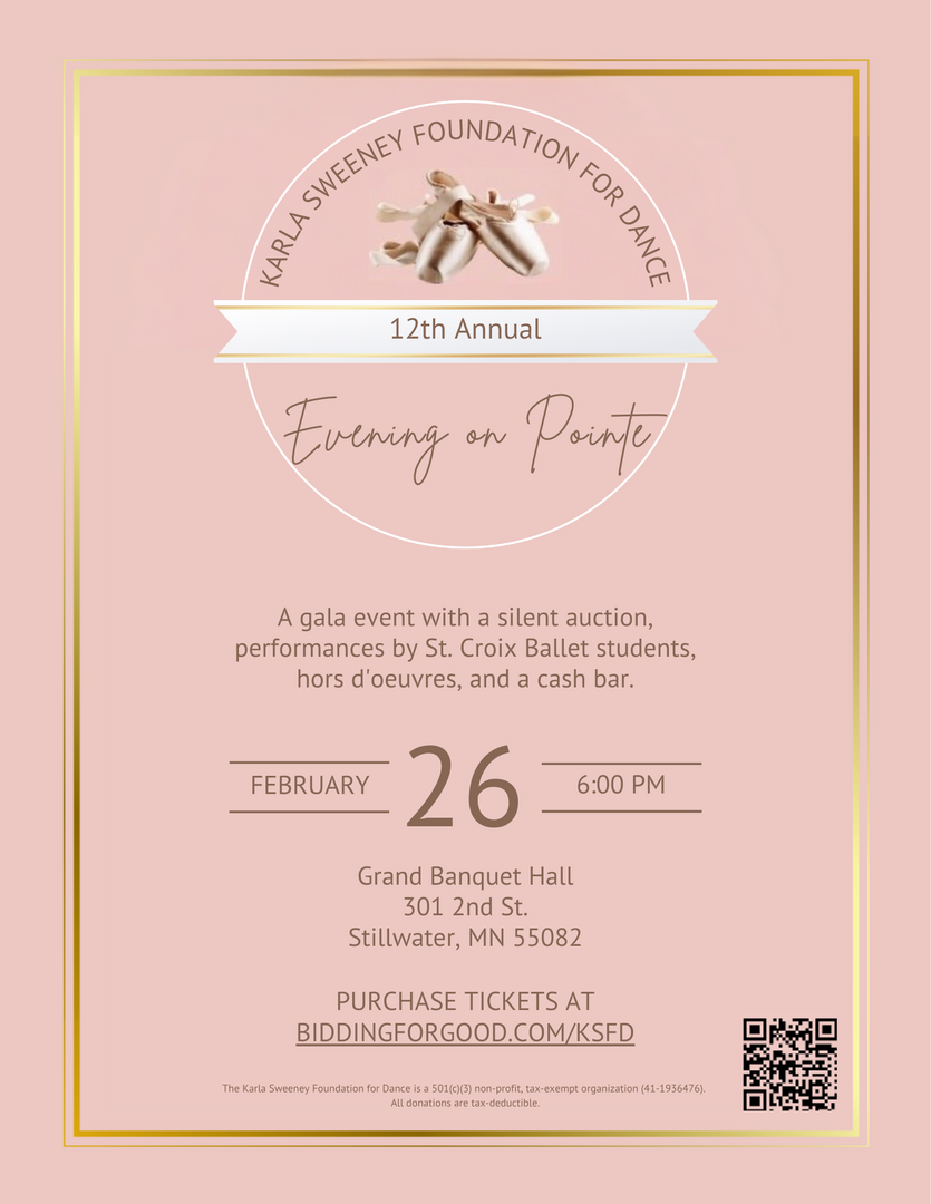 HomeEventsEvening on Pointe Evening on Pointe Thursday, February 26, 2026 6:00 PM - 9:00 PM 6:00 PM - 9:00 PM See all dates and Times The Grand Banquet Hall Parking Deals Get a Ride LYFT UBER Add to Calendar 02/26/2026 06:00 PM 02/26/2026 09:00 PM America/Bahia_Banderas Evening on Pointe Evening on Pointe supports dancers and other artists in the Stillwater area through the Karla Sweeney Foundation for Dance.Event LinksTickets: https://go.evvnt.com/3485216-0 Details & Tickets: https://www.upcomingevents.com/minneapolis/events/the-grand-banquet-hall/evening-on-pointe-603407?ref=uceaddevent The Grand Banquet Hall, 301 2nd Street South, Stillwater, MN, 55082 Set Reminder Categories Arts Oriented, Benefits Charity, Charities, Dancing, Fundraising & Charity, Sports, Volunteering Neighborhoods Battle Creek (Saint Paul)Dayton's Bluff (Saint Paul)Greater Eastside (Saint Paul)Payne Phalen (Saint Paul) Evening on Pointe supports dancers and other artists in the Stillwater area through the Karla Sweeney Foundation for Dance.Event LinksTickets: https://go.evvnt.com/3485216-0 Read More View Less