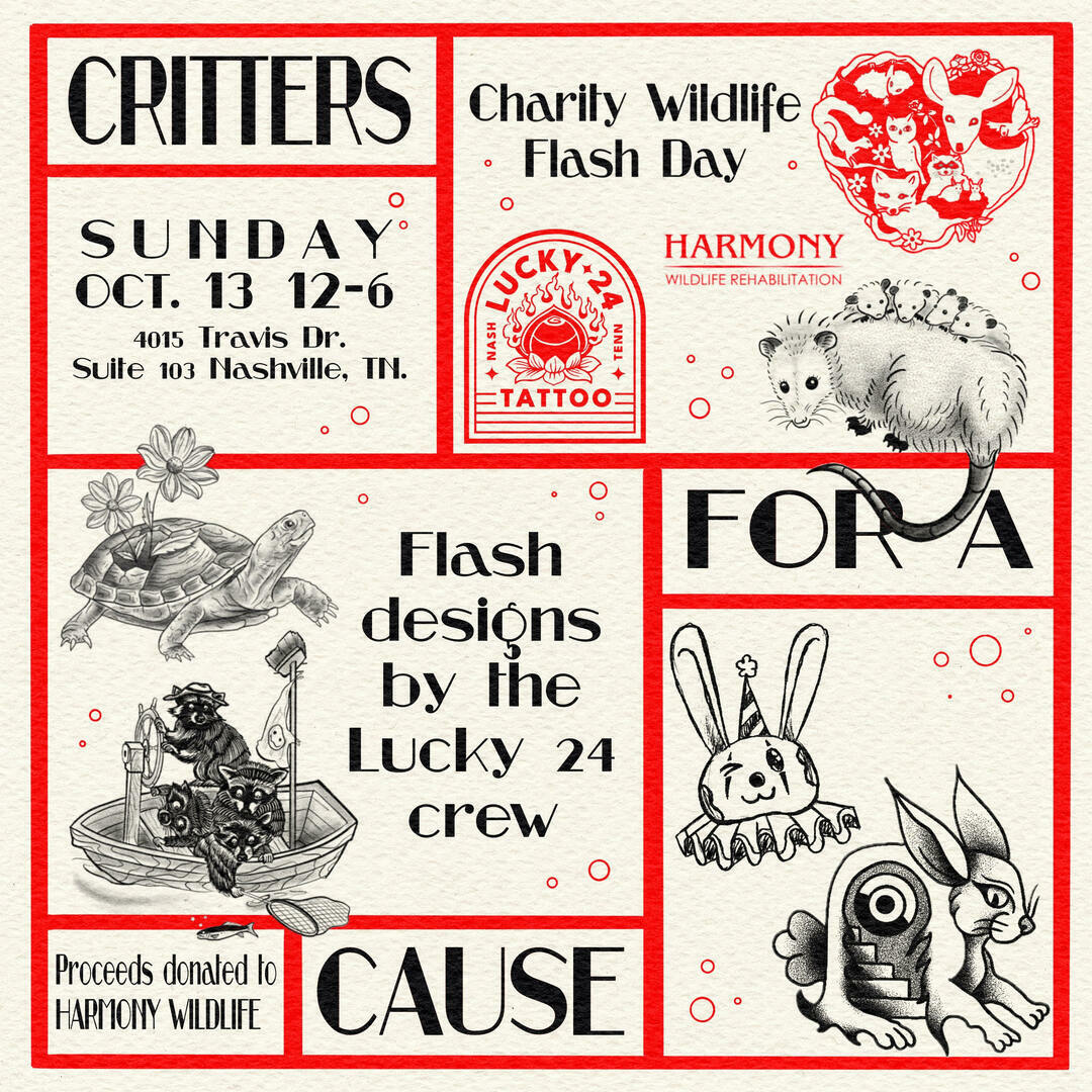 South Nashville, TN – Lucky 24 Tattoo, a new tattoo studio in South Nashville, is excited to announce a special Charity Flash Event in collaboration with Harmony Wildlife. This event aims to raise funds and awareness for Harmony Wildlife’s incredible work rescuing Tennessee’s orphaned and injured wildlife.