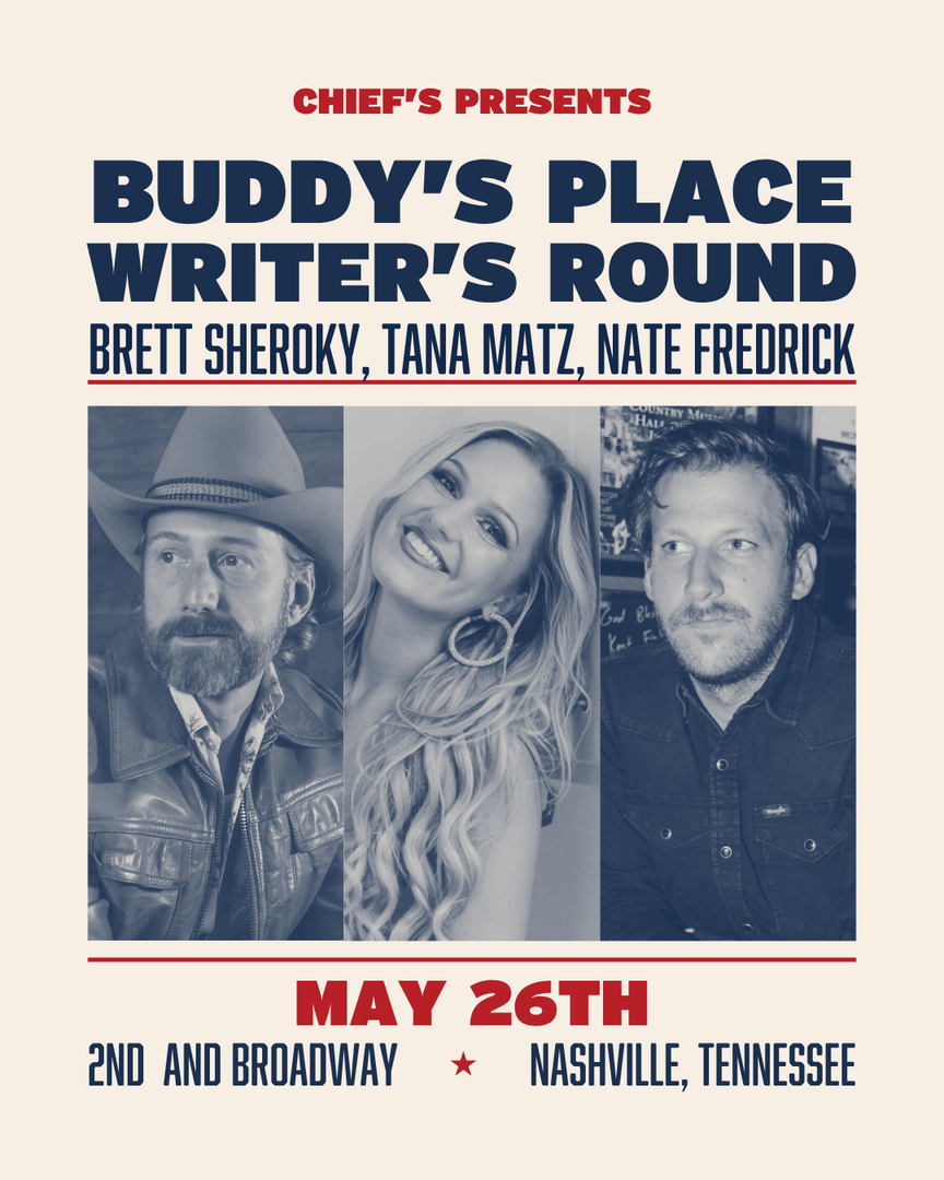 Get your tickets now for a great night of live music, stories and songs with some of Nashville’s best singer songwriter artists on Tuesday, May 26, at 7:00 pm! Buddy’s Place is excited to welcome Brett Sheroky, Tana Matz and Nate Fredrick to the Neon Steeple concert hall, located in the heart of Eric Church’s Chief’s on Broadway. It’s an intimate, up close and personal acoustic night of music, an ALL-AGES SHOW with reserved seating tickets!