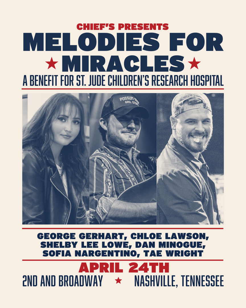 The Muscle Movement Presents their 2nd Annual Melodies for Miracles at Chief’s on Broadway! Songwriters Dan Minogue, Shelby Lee Lowe, Sofia Nargentino, George James, Chloe Lawson and Tae Wright join forces to tell stories, sing songs and raise a little money for a great cause. 100% of proceeds benefit St. Jude Children's Research Hospital.