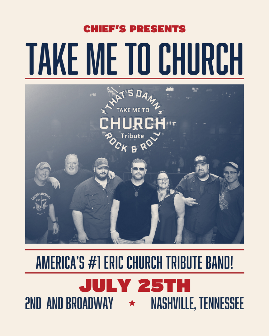 Est. in 2021 Take Me To Church Tribute is a world class homage to the music of Country superstar Eric Church. Recognized as the Top Tribute toThe Chief, TMTC is America’s premiere high-energy, authentic recreation of the top hits and the deep cuts.