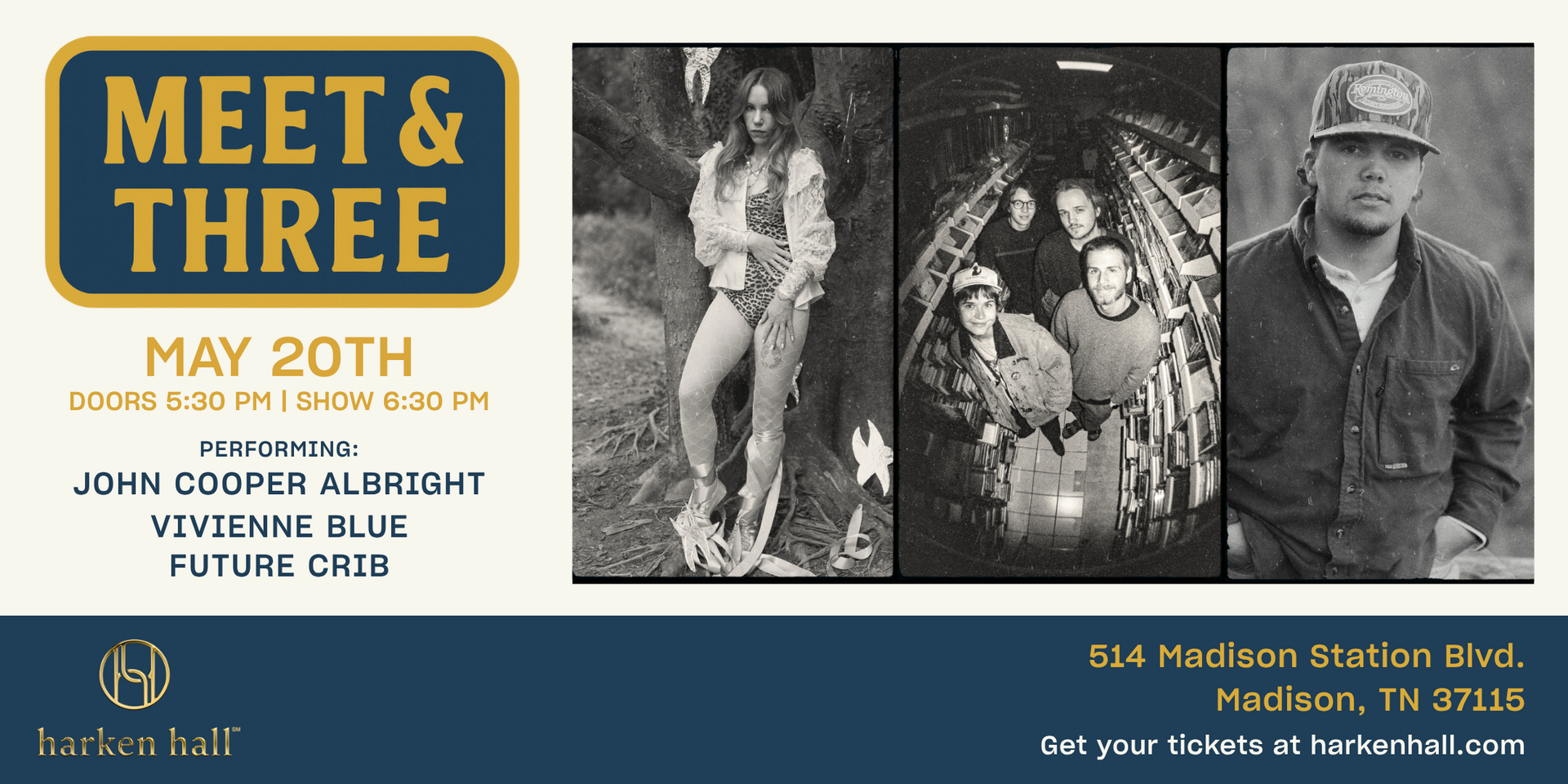 Harken Hall announced Meet & Three Local Music Showcase presented by 514 Productions is set for May 20 featuring John Cooper Albright, Future Crib and Vivienne Blue.